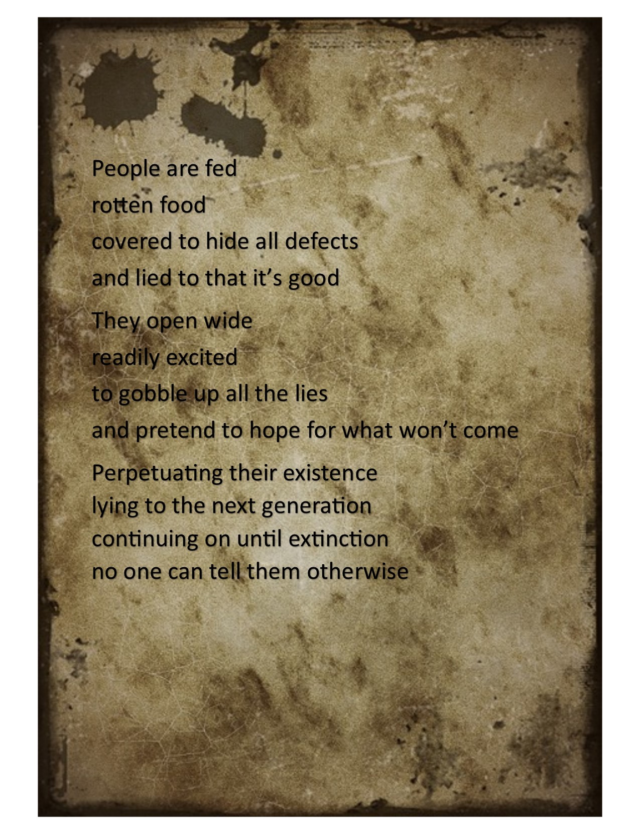 Gripe Poem Posted on October 21, 2015 by espiritumentelibre Share this: Click to share on Facebook (Opens in new window) Facebook Click to share on X (Opens in new window) X Click to share on Pinterest (Opens in new window) Pinterest Click to email a link to a friend (Opens in new window) Email Click to print (Opens in new window) Print Like Loading...