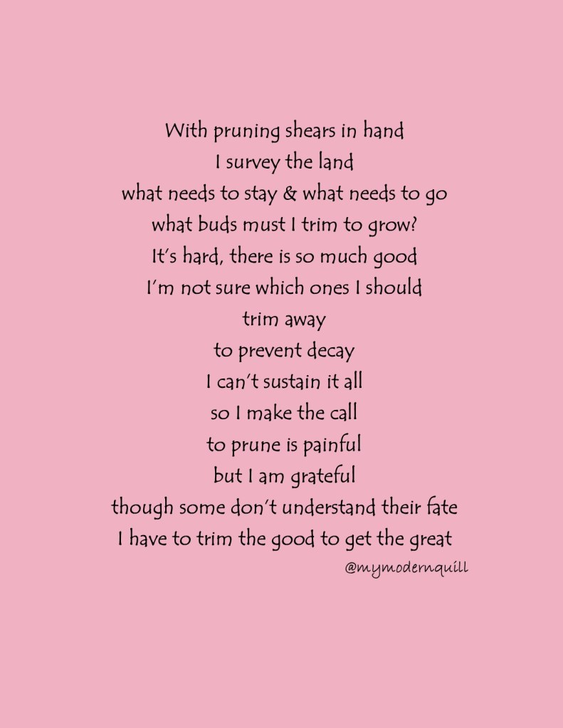 We all have dreams, desire, goals and visions in our lives but there is something holding us back and it’s not always bad. I have pinpointed several “good” areas that just aren’t sustainable anymore if I want to achieve the great things I want to accomplish. I need to prune those things away. It hurts (I’m already resisting!) but pushing through and knowing this will allow the great goals to be achieved is the end game to keep in mind so that you can make the cut.